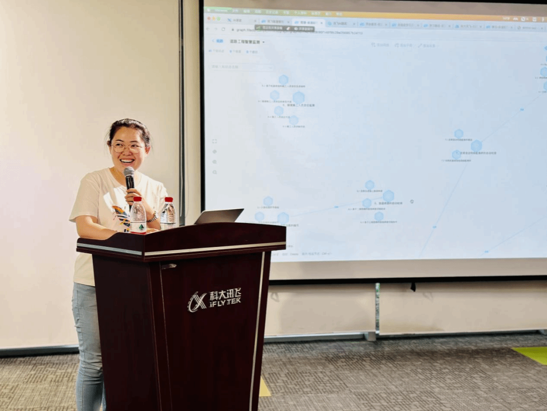 与会教师参观了科大讯飞人工智能展厅,听取了科大讯飞高教北京研究院负责人惠治儒做的“通用人工智能与知识图谱赋能数字化转型与课程建设”主题报告,并以实训形式利用人工智能技术构建课程知识图谱。卢楠老师在“道路工程智慧监测”课程资源前期建设基础上,使用“科大讯飞知识图谱”工具构建了该课程的知识图谱并做会议交流。