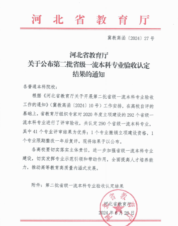 近日,河北省教育厅印发了《关于公布第二批省级一流本科专业验收认定结果的通知》(冀教高函〔2024〕27号),我校城市地下空间工程、软件工程、机械电子工程、国际商务、道路桥梁与渡河工程、测绘工程等6个专业顺利通过验收,被认定为省级一流本科专业。