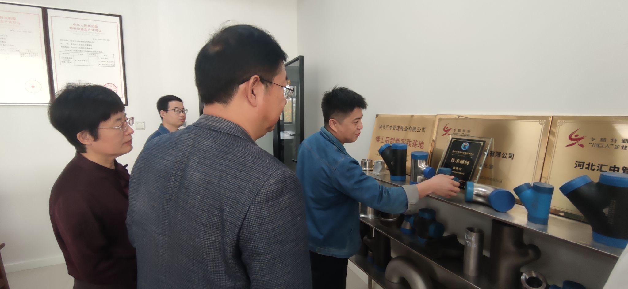 随后,苗立峰一行前往国家重点小巨人企业河北汇中管道装备有限公司,与企业董事长赵伟星等企业领导进行了座谈。河北汇中管道装备有限公司是一家专业管道装备服务企业,产品涉及钢制管件、管道、压力容器和工业机器人四个领域,主要为石油、化工、天然气、电力、造船、核工业、煤化等行业提供服务。汇中公司拥有“国家级专精特新重点小巨人企业”“国家高新技术企业”等荣誉称号,拥有国家特种设备制造许可证,并已取得美国ASME U&S、欧盟CE等国际体系认证。主要市场分布在国内、亚洲(东亚/东南亚)、欧洲、非洲以及中东地区。