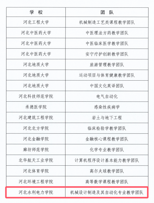 近日,河北省教育厅公布了《关于公布2025年河北省普通本科院校教学名师和优秀教学团队名单的通知》(冀教高函〔2025〕41号)。我校机械设计制造及其自动化专业教学团队获评“河北省普通本科院校优秀教学团队”,机械工程系副主任石岩教授获批“河北省普通本科院校教学名师”。